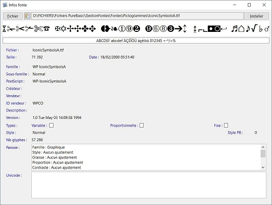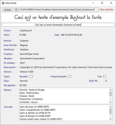 IMPORTANT : Par souci de rapidité, la routine de lecture des données ne travaille qu'à partir des métadonnées. Or, certaines informations affichées, extraites des données compilées dans la fonte, ne s'avèrent pas toujours totalement exactes car incorrectement saisies par le créateur ou mal encodées par le logiciel de création. C'est d'autant plus vrai quand la fonte est ancienne, surtout pour les données Panose et les plages Unicode présentes (C'est le constat que j'en ai tiré). Ce n'est en rien un dysfonctionnement de l'outil.